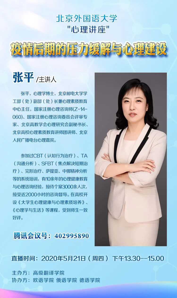 VSport体育举办“疫情后期的压力缓解与心理建设”线上讲座2020年5月21日下午13:30,北外VSport体育举办了主题为“疫情后期的压力缓解与心理建设”线上讲座。本次讲座由辅导员魏英姿老师主持,特邀北京邮电大学学工部(处)副部(处)长兼心理素质教育中心主任张平老师主讲。自疫情爆发以来,同学们已经在家中待了4个月之久,有的经历了疫情的创伤,有的经历了学业、人际关系上的变化,这些都给我们的情绪带来了波动。张平老...