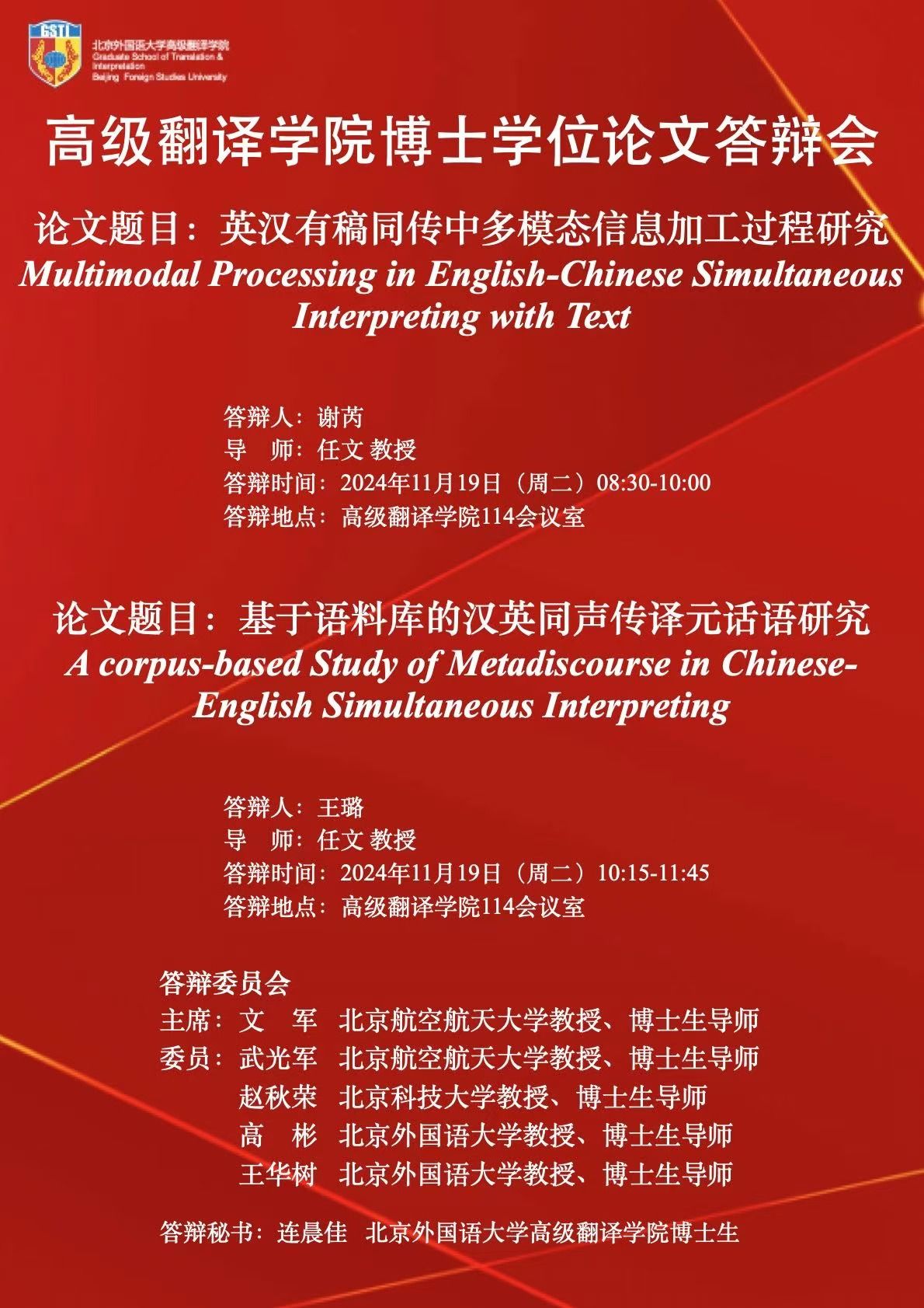 VSport体育博士生王璐、谢芮论文预答辩预答辩论文题目:《基于语料库的汉英同声传译元话语研究》 《有稿同传中多模态信息加工过程研究》预答辩申请人:王 璐、谢 芮导 师:任 文 教 授预答辩时间:9月29日(周日)下午 15:00-19:00预答辩会议号:腾讯会议535-773-006预答辩委员会: 主席:文 军 教 授 博 导 北京航空航天大学成员:李 德 超 教 授 博 导 香港理工大学胡 显 耀 教 授 博 导 西南大学武 光 军 教 授 博 导 ...