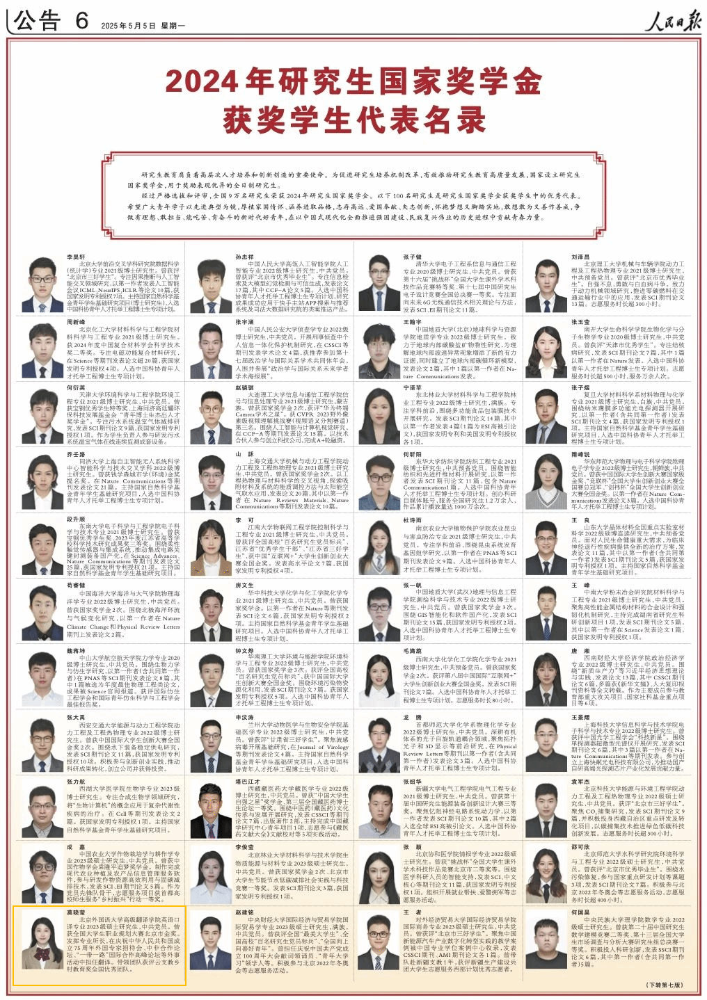5月5日,VSport体育英语口译专业2023级硕士研究生莫晓莹,获登《人民日报》2023-2024学年度研究生国家奖学金获奖员工代表名录。2023-2024学年度,全国共有9万名研究生荣获国家奖学金。其中,100人登上《人民日报》国家奖学金获奖员工代表名录。莫晓莹 VSport体育英语口译专业2023级硕士研究生,中共党员。曾获全国老员工职业规划大赛北京市金奖。发挥专业所长,在庆祝中华人民共和国成立75周年外国专家招待会、...