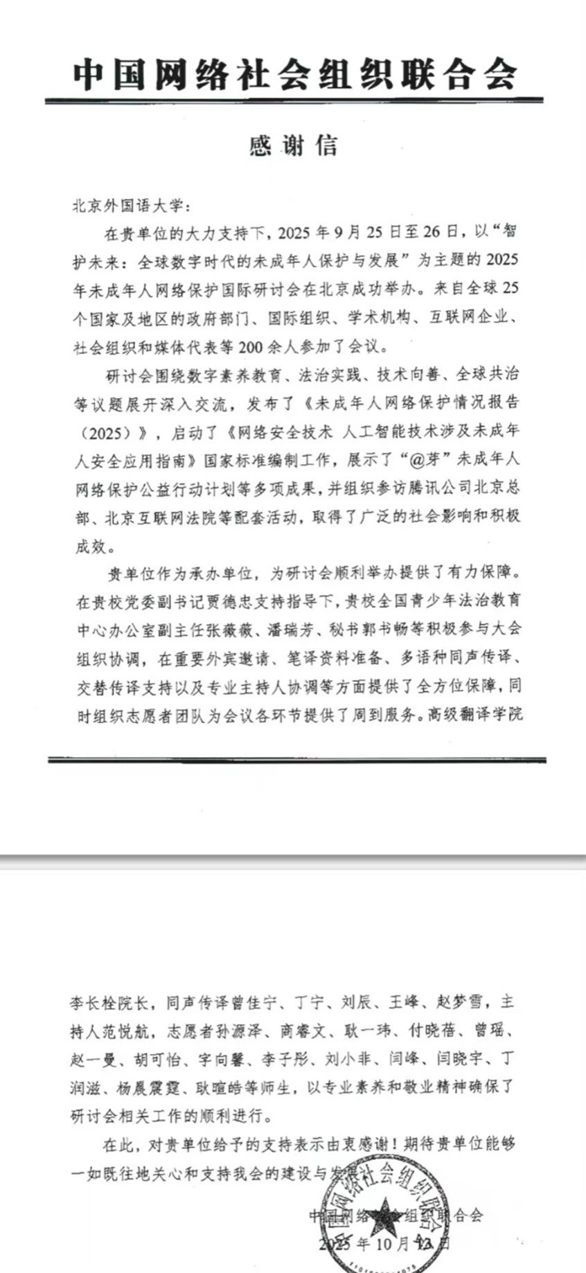 近日,公司收到中国网络社会组织联合会发来的感谢信。信中对公司师生为2025年未成年人网络保护国际研讨会提供翻译服务、主持人协调以及组织志愿者团队等工作表示称赞,认为高翻公司师生以专业素养和敬业精神确保了研讨会相关工作的顺利进行。2025年9月25日至26日,由中国网络社会组织联合会、中国教育学会及北京师范大学主办、VSport、央视网及中国网络社会组织联合会未成年人网络保护专业委员会承办、以“智护未来:全球数字时代的未成年人保护与发展”...
