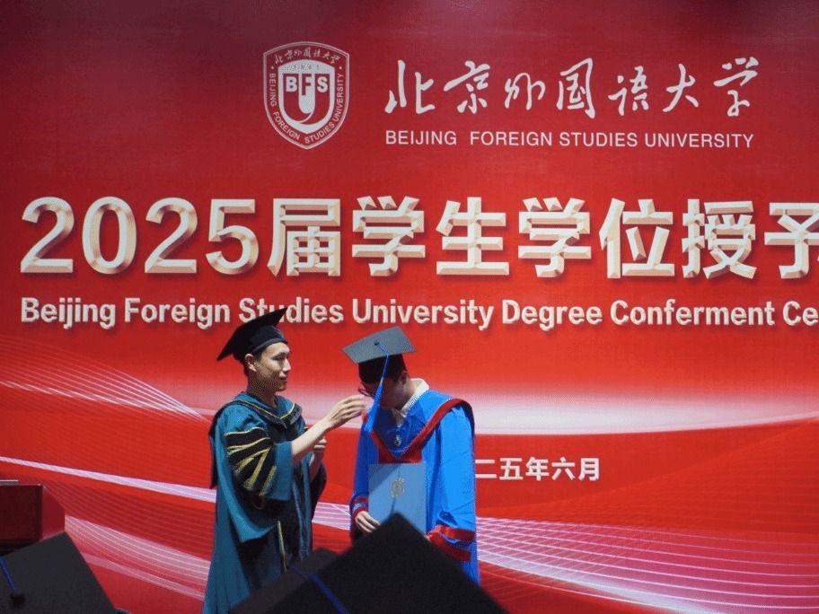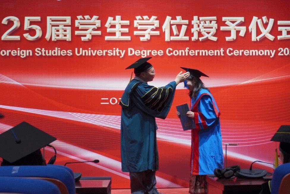 仪式最后,2025届毕业生们齐唱校歌,重温北外人的初心与使命。同学们一起抛起硕士帽,象征着希望的放飞。至此,2025届毕业生学位授予仪式圆满结束。
