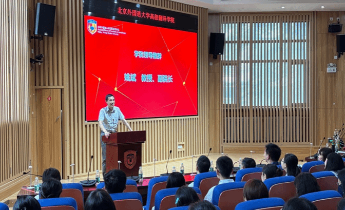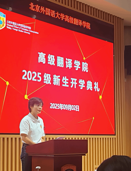 任文经理在致辞中向新生提问:“生成式AI呼啸而来,你们为何仍选择高翻?”她指出,真正的译者应避免做“埋头沙堆的鸵鸟”,而要做“能思考的芦苇”,在矛盾中寻求和谐,在不确定中锚定方向。她回顾了翻译的“三重悖论”,鼓励大家成为 “六边形战士”,培养语符转换、译后编辑与定稿、审美判断、批判思维、技术驾驭与跨文化沟通六大能力。她认为,无论对学术型还是专业型学位的研究生来说,学术与实践都是“多和少”,而非“有和无”的问题。她以自身经历为例,鼓励大家从“元无知”到“知无知”,再到“有智识”。她最后寄语:每一次咬牙坚持,都是未来成长的基石。
