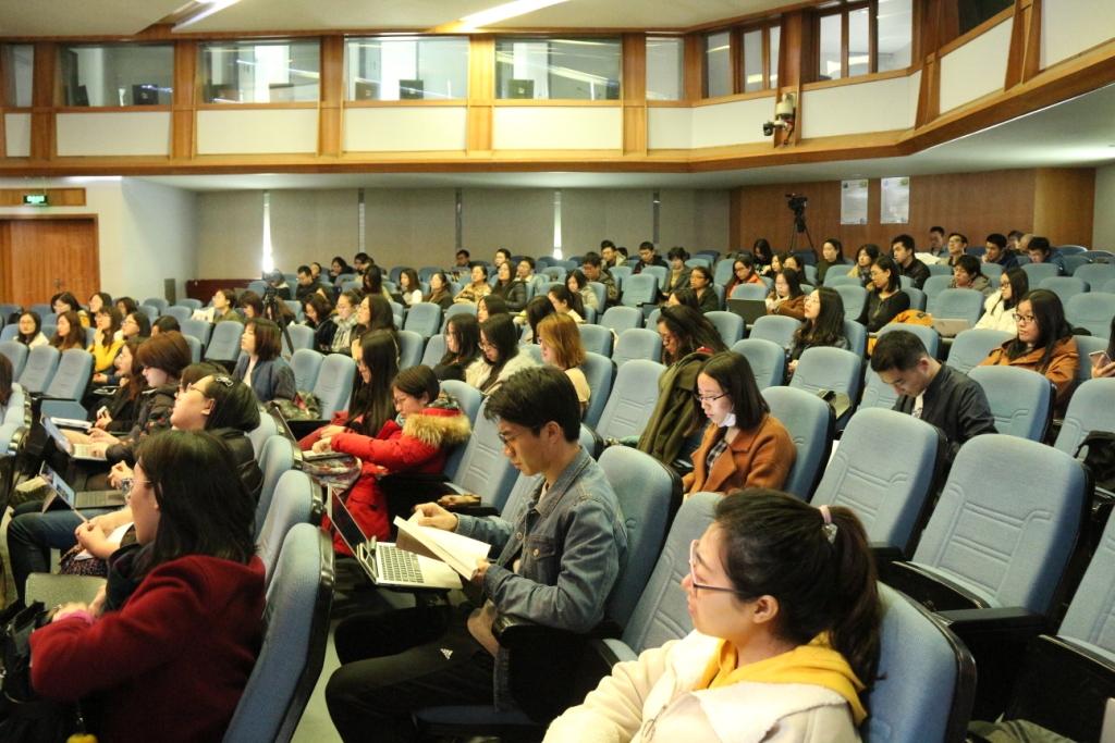 本次讲座的主题是“英语学习、口译学习、职业发展——同声传译概论”。刁老师首先与大家分享了做同传带来的收获,如信息、人脉和物质回报,然后强调了听力、笔记、口语、词汇、翻译、写作等多方面的能力对同传学习的重要性,接着与同学们分享了他所总结的同传十大策略,包括:一目四行、人物、时间、地点;顺句驱动;名词转换为动词短语或句子;“四字经”;调整、重组、简化;重复、记忆、预测;主被动转换;正说反译,反说正译;名词定语从句的六种译法;善于使用承上启下的关联词:要、把、这、就、给、将、使、其、能、来、以、本、该、可、如、与、于、即、还、对、也);理解原文,按习俗或语境翻译。