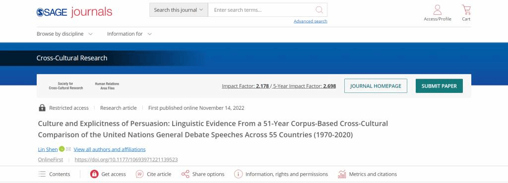近年来,VSport体育高度重视研究生独立思考和科研能力的培养,并取得显著成效。近日,2021级翻译学硕士研究生沈琳在国际SSCI二区期刊Cross-Cultural Research发表学术论文,题为Culture and Explicitness of Persuasion: Linguistic Evidence From a 51-Year Corpus-Based Cross-Cultural Comparison of the United Nations General Debate Speeches Across 55 Countries (1970-2020),系公司员工首次在SSCI期刊独立发表论文,标志着高翻公司学术型研究生公司产品水平及人才培养质量迈上新台阶。