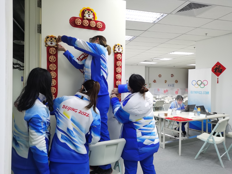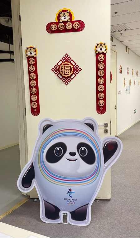 不知不觉,春节来临,志愿者和老师们一起贴上各种新春海报、福字、对联、小灯笼,无论是我们日常工作的记者工作间,还是驻地酒店,都充满了浓浓的年味儿。说起来,这还是我第一次离家过年,虽然不在自己的“小家”和家人团聚,但却融入了一个更加温暖的“大家”。我相信,和北外的冬奥志愿者以及老师们一起度过的这次春节,将会成为我最难忘的一个春节!