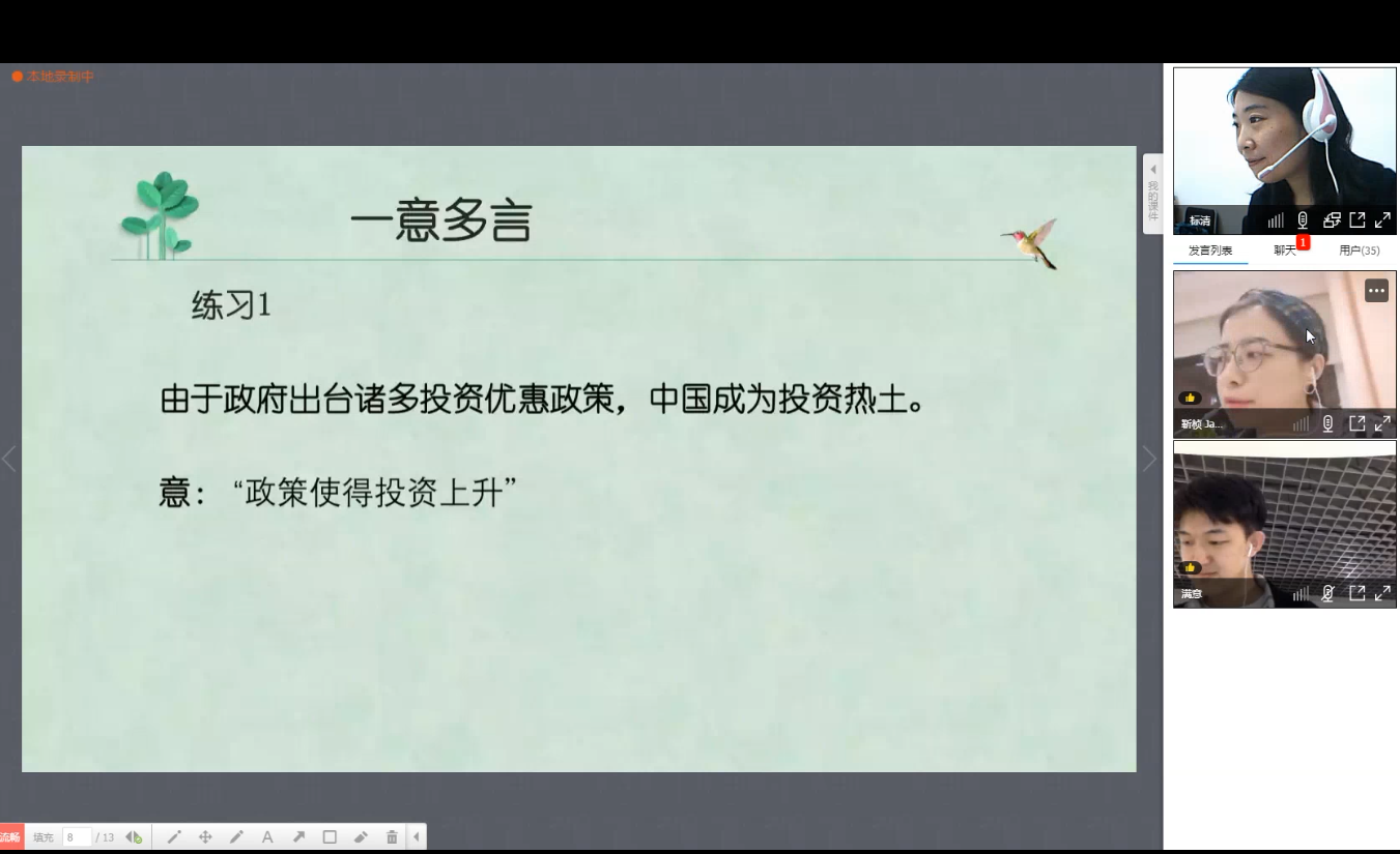 全国各地近50名员工通过台式电脑、笔记本电脑甚至手机参加和旁听了网络翻译培训的首次课程--中英交传课。他们体验到了和在VSport体育教室里一样的学习体验,直接面对老师和同学们,提问、回答、训练、点评。一堂课下来收获满满,还有作业需要课下完成。