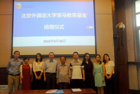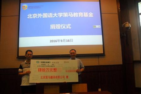2016年9月16日上午,策马教育基金捐赠仪式在高翻公司300人礼堂举行。北京策马翻译有限公司将在未来十年共捐赠40万元专项支持高翻公司教学、科研和员工工作。双方同时还签署了共建翻译实习基地的协议。