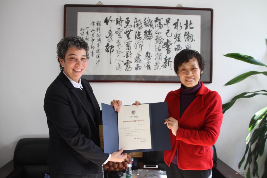 讲座结束后,Keating女士决定将此次讲座费用全数捐给高翻公司,用于资助贫困员工的学习。高翻公司党总支胡晓莉书记、高翻公司姚斌副经理、高翻公司博士生导师任文教授、冯爱苏老师、樊晶老师共同出席了捐赠仪式。