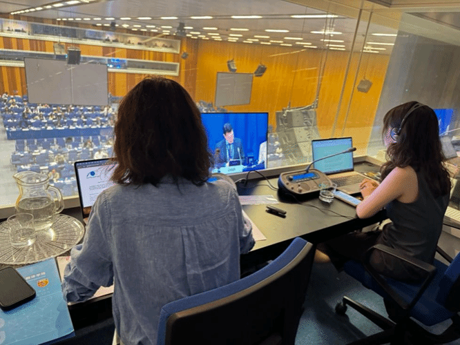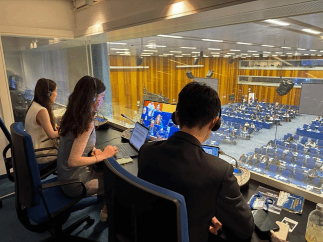 实习期间,员工们走进联合国会议实地场景,亲身体验联合国口译工作的真实节奏。他们全程参与联合国和平利用外层空间委员会第68届会议和工业发展组织理事会的部分议程,并观摩中文箱译员的翻译实战,观察多边磋商中代表的字斟句酌和据理力争,体会语言多层意义在外交场合的重要性。